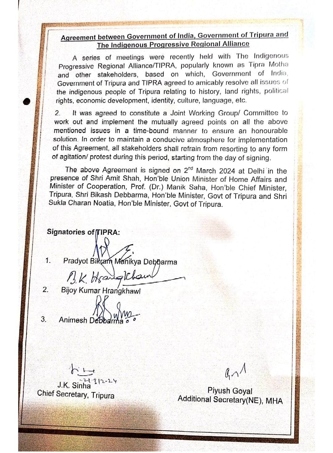 Agartala, March 02: The central government, Tripura government and TIPRA Motha has signed a tripartite agreement to address the issues of indigenous people in the state.