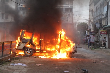 Earlier, some incidents were there but these were not to such scale. The situation turned volatile within a few minutes triggering panic among the common people. All that happened in the presence of a large deployment of police and TSR personnel. The policemen present at the scene continued to witness the whole incident like mute spectators.