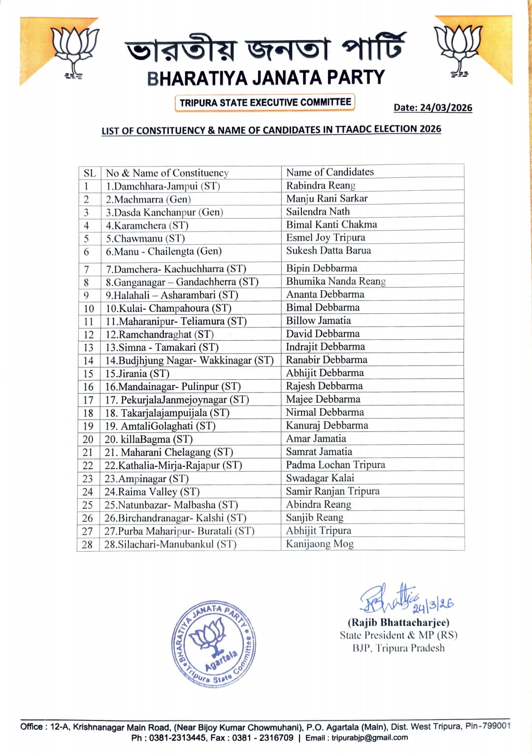 Agartala, Mar 24: The Bharatiya Janata Party on Tuesday unveiled its full list of candidates for all 28 seats in Tripura Tribal Areas Autonomous District Council (TTAADC), soon after giving a major jolt to Tipra Motha.