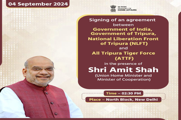 Agartala, Sept 03: In a major development, a Memorandum of Settlement will be signed between the Government of India, Government of Tripura and representatives of National Liberation Front of Tripura (NLFT) and All Tripura Tiger Force (ATTF), the banned militant outfits, in presence of Union Home Minister Amit Shah in New Delhi on Wednesday.