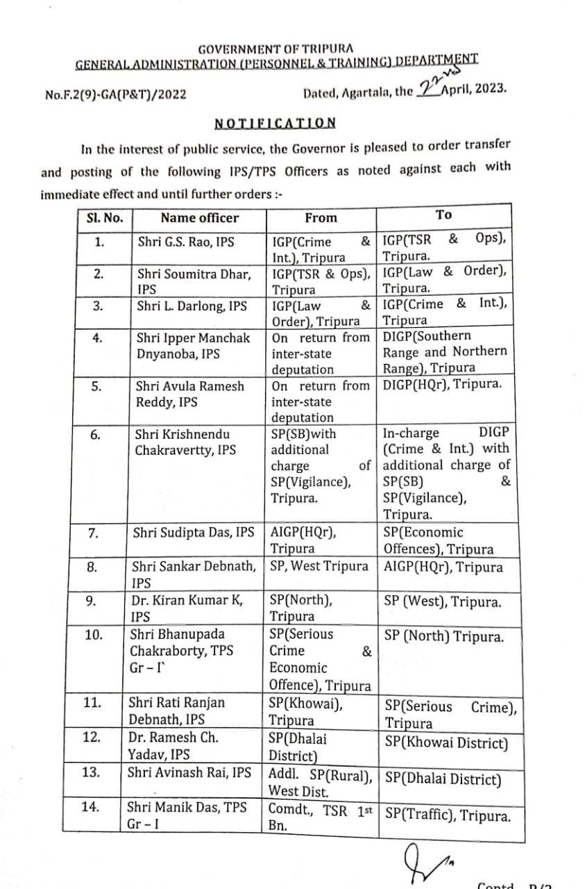 Agartala, Apr 24: In a reshuffle, the Tripura government has transferred thirteen IPS and three TPS officers on Saturday night.
