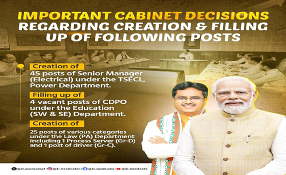 Besides, the Cabinet has approved creation and filling of several posts under several departments. These included 45 posts of Senior Manager (Electrical) in the Tripura State Electricity Corporation Limited (TSECL) under the Power Department and 25 posts of various categories under the Law (PA) Department.