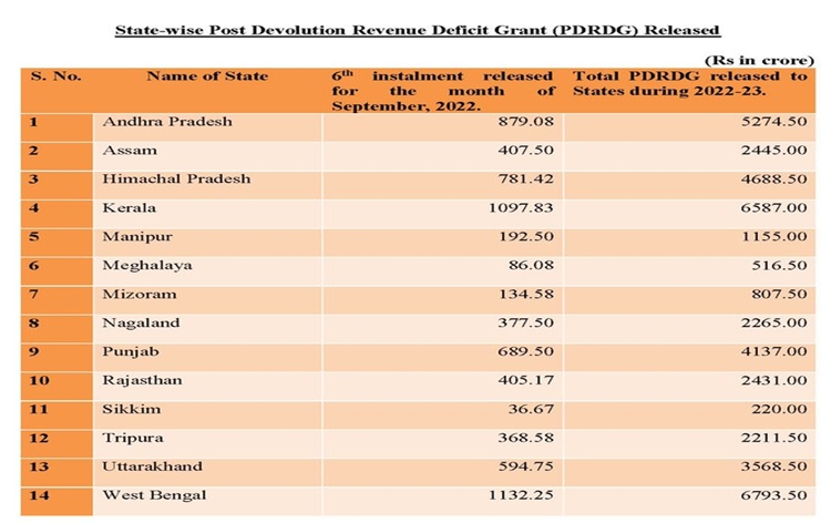 The Finance Commission has recommended a total Post Devolution Revenue Deficit Grant of Rs. 86,201 crores to the 14 states for the financial year 2022-23.