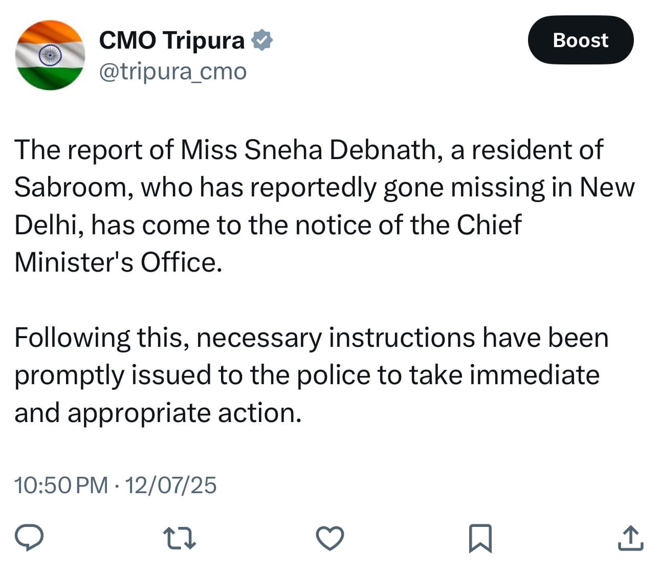 "The report of Miss Sneha Debnath, a resident of Sabroom, who has reportedly gone missing in New Delhi, has come to the notice of the Chief Minister's Office. Following this, necessary instructions have been promptly issued to the police to take immediate and appropriate action,” read a statement from the CMO’s official social media account.