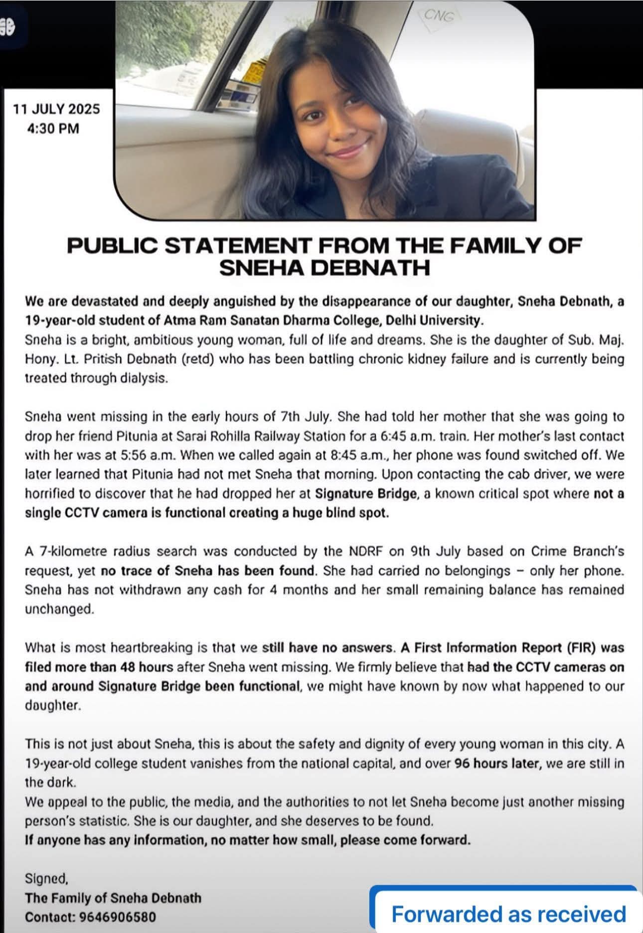 Tracing her movement through available leads, the family contacted the cab driver who confirmed that Sneha was dropped off near Delhi’s Signature Bridge—a location notoriously known for safety concerns and critically, lacking functional CCTV surveillance. This has created a significant challenge in reconstructing her movements, according to family sources.